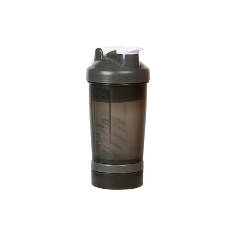 Botella mezcladora fabricada en polipropileno con agitador de acero inoxidable, 2 compartimentos desprendibles, tapa de seguridad, medidor de contenido en onzas y mililitros, capacidad de 560 ml (18 oz).
