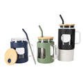 Cilindro de vidrio con asa y manga de silicon graduada en ml. Tapa de bambu con sistema de push y ranura para popote. Incluye popote metalico con boquilla de silicon. Vidrio resistente a bebidas calientes y frias. Caja individual incluida. El bambu es un producto natural el cual puede presentar variaciones en tonalidades y vetas.