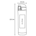 Termo de acero inoxidable con doble pared, tapa que evita derrames. Cuenta con un candado de seguridad en la boca de la botella.