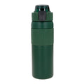 Termo de doble pared de acero inoxidable, insulado al vacío, acabado rugoso, con manga de silicón, tapa enroscable, asa y botón con candado de seguridad.