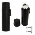 Termo de acero inoxidable y doble pared insulado al vacío con tapa de seguridad la cual puede ser utilizada como taza.
