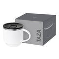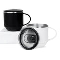 Taza doble pared. Cerrado al vacio. Pared interna y externa de acero inoxidable. Terminado rugoso. Incluye tapa de plastico con sistema push y valvula de seguridad. Mantiene temperatura caliente 6 hrs y temperatura fria 12 hrs. Incluye caja individual.