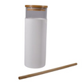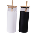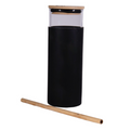 Vaso de vidrio con una capacidad de 500 ml. Tiene un protector de silicona y una tapa de bambú con orificio para popote. Incluye un popote de bambú.