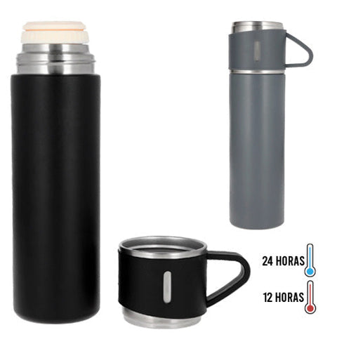Termo con doble pared de acero inoxidable insulado al vacío. Acabado rugoso y tapa de rosca con asa que se utiliza como taza.