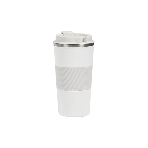 Vaso de acero inoxidable doble pared, tapa de plástico con boquilla y manga de silicón. Fabricado en materiales de grado alimenticio, mantiene bebidas frías o calientes por un largo tiempo. No usar en microondas. Capacidad de 510 ml. Incluye caja de cartón individual