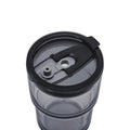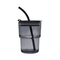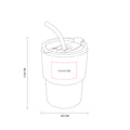 Vaso de vidrio de una pared. Tapa y sobre tapa de plastico con sistema push y ranura especial de silicon con tapon para popote. Incluye popote de plastico. Caja individual incluida.