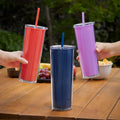 Termo de plastico doble pared. Pared interna de color, texturizada a rayas, y pared externa lisa y transparente que, en conjunto, ofrecen un diseno moderno y vibrante. Incluye tapa de plastico con sistema push y popote a juego. Capacidad de 22 Oz. Base de 7.5 cm de diametro. Incluye caja individual.