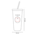 Doble pared. Pared interna y externa de plastico. Tapa de plastico con cierre de rosca. Terminado ruber y textura de picos. Capacidad 22 Oz. Base de 6.8 cm de diametro. Incluye popote y caja individual.