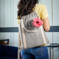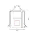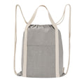 Bolsa-mochila gris ecológica de algodón reciclado con tirantes de cordón y cerrado de jareta. Cuenta con una bolsa frontal y asas para usar como bolsa.