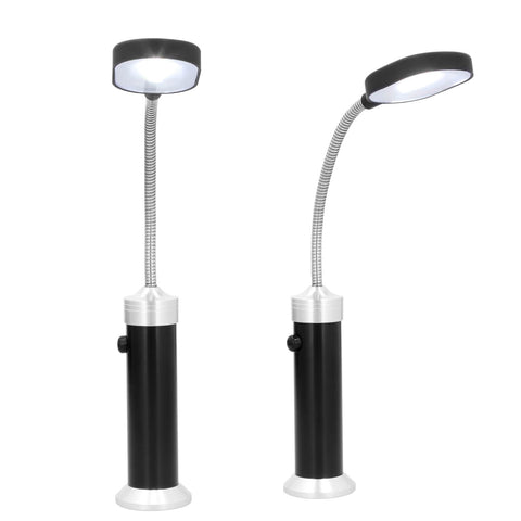 Lámpara portátil metálica con luz LED que enciende con 3 baterías AAA (no incluidas), botón de encendido de click, soporte flexible e imán en la parte inferior.