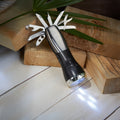 Lampara de 4 LEDS con flash. Incluye destapador, tijeras y 6 diferentes navajas con distintas funciones. Incluye 3 baterias AAA.
