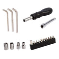 Contiene desarmador con 10 puntas diferentes e intercambiables, 3 llaves hexagonales, dado extension y 4 dados. Incluye estuche de tela.