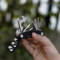 Kit de herramientas para bicicleta. Incluye 6 parches redondos y 2 palancas de plastico para neumatico, 2 tubos de goma para fijar valvulas, 1 herramienta de lijado, 1 herramienta multifuncion 16 en 1 con llaves allen y destornilladores. Estuche compacto de EVA con elastico que lo hace facil de transportar y se ajusta de manera conveniente a la bicicleta o al equipo de ciclismo.