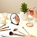 Espejo circular de mano con asa plegable. Su asa multifuncional se convierte en soporte y tiene un orificio para colgarlo facilmente donde lo requieras.