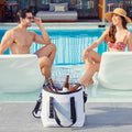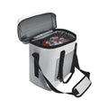 Interior y exterior plastificado impermeable. Bolsa principal con cierre, bolsillo frontal. Incluye asa de mano con velcro y correa larga ajustable con soporte acojinado. Capacidad para 36 latas.