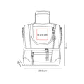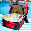 Interior plastificado impermeable. Bolsa principal, red interna para separar, bolsa frontal con cierre, bolsa lateral de red y correa ajustable. Capacidad para 12 latas.