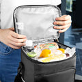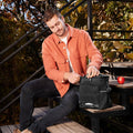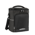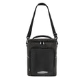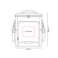 Hielera con interior plastificado y sellado. Bolsillo frontal con cierre, incluye asa superior acolchada y correa ajustable con broche removible. Capacidad para 12 latas.