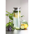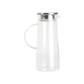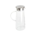 Jarra para agua de diseño transparente fabricada en vidrio de borosilicato. Cuenta con capacidad de 1,800 ml, y peso de 430g. Inlcuye tapa en color metálico, de acero inoxidable, y asa.