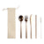 Juego de cubiertos fabricados en acero inoxidable; incluye cuchillo, tenedor, cuchara, popote y cepillo limpiador. Incluye bolsa de algodón de fácil cierre y apertura. Los cubiertos se pueden grabar y la bolsa cuenta con amplia área para impresión. Son ideales para viajar y responsables con el medio ambiente.