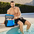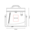Interior y exterior plastificado impermeable. Bolsa principal y bolsillo frontal con cierre. Al frente cuenta con accesorio para colgar llaves o destapador. Incluye asa de mano y correa larga ajustable. Capacidad para 16 latas.