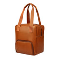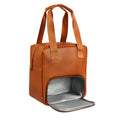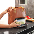 Lonchera de curpiel comoda y portatil. Ideal para llevar tus alimentos a la oficina o escuela. Compartimento principal y bolsa frontal con cierre. Asas de tela con agarre de curpiel.