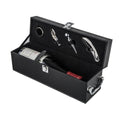 Set para vinos de curpiel con 4 accesorios: Incluye saca corchos, boquilla, corta gotas y corcho metálico.