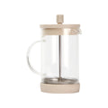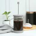 Prensa francesa de 800 ml, cuerpo fabricado en vidrio de borosilicato y acero inoxidable con tapa fabricada en polipropileno. La parte de abajo está fabricada en plástico tipo TPR característico por su flexibilidad, durabilidad, además, es removible para fácil limpieza.