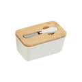Recipiente para barras de mantequilla fabricado en cerámica y tapa de madera con función hermética y espacio para almacenar el cuchillo. Incluye cuchillo untador. La combinación de la cerámica y madera vuelven este recipiente una opción súper elegante para tu cocina.