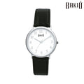 Reloj ejecutivo marca BAKIÓ, caja de acero inoxidable y correa de piel. Resistente al agua (5 ATM). Incluye estuche. Impresión en serigrafía.