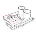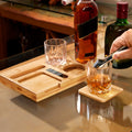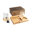 Set de bar con base de bambu. Incluye 2 vasos de cristal para whisky, 4 cubos enfriadores de granito, 2 portavasos de bambu y pinzas para hielo de acero inoxidable. Incluye caja individual.