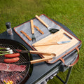 Estuche con asas y broches para cerrar. Incluye tabla de madera, pinzas, tenedor, cuchillo y pala con destapador. La madera es un producto natural el cual puede presentar variaciones en tonalidades y vetas.