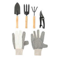 Set de jardin que incluye pinzas de corte, pala ancha, horqueta, rastrillo, guantes de algodon con antiderrapante y bolsa con asa.