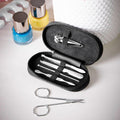 Incluye 6 accesorios: 1 tijeras, 1 pinza para cejas, 1 corta unas, 1 lima de unas, 1 empujador de cuticula y 1 limpia unas. No para uso profesional.