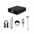 Incluye sacacorchos con navaja y destapador, stopper, arillo, termometro, cortador y caja de madera con cerrojo tipo hebilla.