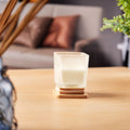 Vela decorativa cuadrada con tapa de bambu y acabado tipo frosty. Aroma a vainilla. El bambu es un producto natural el cual puede presentar variaciones en tonalidades y vetas.