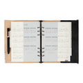 Agenda semanal con 140 hojas. Contiene datos personales, calendarios 2025-2026-2027, planeador 2026, presupuesto de gastos, seguimiento de nuevos habitos, organizador de tareas, planeador de proyectos y dias festivos. Incluye 7 secciones de separador de carton, 3 hojas con stickers, boligrafo metalico y caja individual tipo regalo.