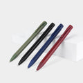 Bolígrafo metálico con acabado mate y clip a color. Mecanismo pulsador.