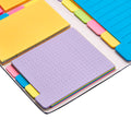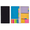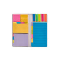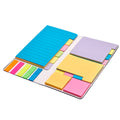 Incluye notas adhesivas a rayas en 6 colores con 10 hojas cada una, banderines adhesivos en 5 colores con 25 notas cada uno, notas adhesivas con puntos en 4 colores con 15 notas cada uno, notas adhesivas en 4 colores con 15 hojas cada uno y un par de notas adhesivas con 45 notas cada uno.