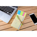 Incluye boligrafo ecologico, notas en color beige, notas adheribles de colores y banderas de colores.