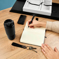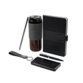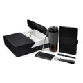 Exclusivo set de regalo. Opcion perfecta para un obsequio de alto valor y calidad. Este set viene en una elegante caja negra con solapa de abertura central, lo que no solo proporciona un acceso facil al contenido, sino que tambien anade un toque sofisticado al diseno. El interior de la caja presenta un color neutro que realza el aspecto general, creando un hermoso contraste con el exterior negro. Incluye termo con doble pared metalica, cerrado al vacio, tapa con sistema de rosca, sobretapa de push y ranura especial con tapon para popote, tambien incluye popote metalico con boquilla de silicon. Libreta de 80 hojas de raya, cubierta rigida de curpiel, separador interno y broche magnetico. Boligrafo metalico con sistema twist y terminado rubber. Llavero metalico combinado con curpiel, aro con giro de 360°. Bateria auxiliar para smartphone de 10,000 mAh, incluye 2 puertos USB, 1 micro USB y 4 LEDs indicadores de carga.
