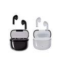 Audifonos bluetooth con base recargable. Controles integrados touch para llamadas, volumen y reproduccion de audio. Reproduccion de musica 2 a 3 hrs aproximadamente. Rango de conexion de 10 metros. Incluye estuche de carga y cable cargador USB.