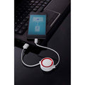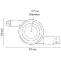 Cable retractil cargador y para transferencia de datos. Compatible con USB y micro USB. Incluye placa y marco circulares. Longitud de cable 73 cm aprox.