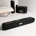 Bocina de plástico portátil con Bluetooth, placa de plástico, radio FM, botón de encendido y apagado, entrada AUX. Entrada micro SD, entrada USB y entrada micro USB. Batería recargable, con duración de 3 horas.