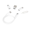 Kit de cable de conexion con adaptadores. Este kit permite tanto la carga rapida de tus dispositivos como la transferencia de datos, asegurando que siempre estes conectado. Equipado con adaptadores intercambiables, es compatible con una amplia gama de dispositivos, ofreciendo una solucion integral para tus necesidades tecnologicas. Incluye cable de 25 cm de largo con doble conexion tipo C y permite una carga maxima de 60W. Incluye adaptador tipo C a micro USB, adaptador tipo C a lightning y adaptador USB a tipo C, permitiendo una carga maxima de 2.4A cada uno. Adicional, incorpora ranura para tarjeta SIM, ranura para tarjeta de memoria (no incluidas) y pin para expulsion de tarjeta SIM. Incluye caja individual.