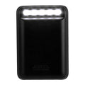 Bateria auxiliar para smartphone con linterna LED, capacidad 6,000 mAh y 4 LEDs indicadores de carga. Cuenta con 2 salidas USB y entrada micro USB. Incluye cable cargador compatible con USB y micro USB.