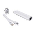 Bateria auxiliar para smartphone, capacidad 2,600 mAh. Textura tipo piel. Puerto USB y micro USB. Contiene indicador de carga de 1 LED y cable micro USB de silicon con argolla.