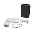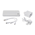 Incluye bateria auxiliar para smartphone de 8,000 mAh con 2 puertos de carga micro USB y tipo C, 2 puertos USB y 4 LEDs para indicar nivel de carga, cargador de pared con entrada USB, audifonos con control de volumen y funcion play/pausa, cable cargador USB con entradas micro USB, tipo C y lightning. Incluye estuche con cierre.