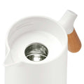 Jarra termica doble pared. Interior de vidrio y exterior de plastico. Tapa con boton dispensador y asa de bambu. Base removible con sistema de rosca que permite retirar facilmente el interior para una mejor limpieza. Mantiene temperatura caliente y fria 6 hrs. Incluye caja individual.