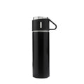 Set de regalo con 1 termo cuya tapa sirve como taza y 2 tazas adicionales. Termo doble pared cerrado al vacio, pared interna y externa de acero inoxidable, tapa interna de rosca con sistema push para verter facilmente sin retirar el tapon, mantiene temperatura caliente 6 hrs y temperatura fria 8 hrs. Las tazas de acero inoxidable con un recubrimiento y asa de plastico. Incluye Caja de regalo.