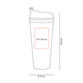 Doble pared. Pared interna y externa de plastico. Tapa de plastico con sistema de rosca. Sobre tapa con sistema de push. Incluye popote. Cuerpo y tapa con terminado tipo rubber. Caja individual incluida.